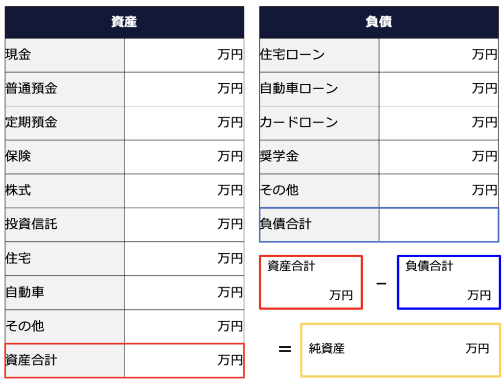 資産が確認できたら、負債も同様に確認します。住宅ローンや車のローンなどの年末時点の残高を確認しておきましょう。資産と負債がわかったら、資産から負債を引いた金額が「純資産」となります。資産・負債・純資産をまとめた表を「バランスシート」(貸借対照表)といいます。