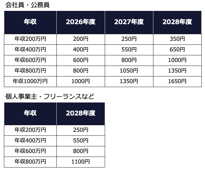 また、個人事業主やフリーランスも、2028年度には年収600万円だと月額800円ですから、年9600円の負担です。