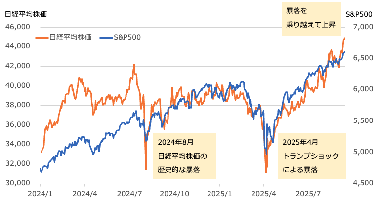 ただし、グラフをみると、単純に右肩上がりだったわけではないことがわかります。2024年8月には「令和版ブラックマンデー」と呼ばれるほどの暴落がありましたし、2025年4月には米トランプ大統領が発表した相互関税などの影響による「トランプショック」が起きています。