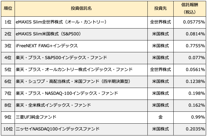 人気はやはり「オルカン」の愛称で知られる「eMAXIS Slim全世界株式(オール・カントリー)」。オルカンは名前のとおり、全世界株インデックスファンドです。オルカンに次ぐ「eMAXIS Slim米国株式(S&P500)」の「S&P500」は米国の株価指数ですので、米国株に投資するインデックスファンドです。3位以下も全世界、または米国のインデックスファンドが並んでいます。唯一「三菱UFJ純金ファンド」のみ金(Gold、厳密には「金に投資する純金上場信託(ETF)」)に投資するファンドになっています。