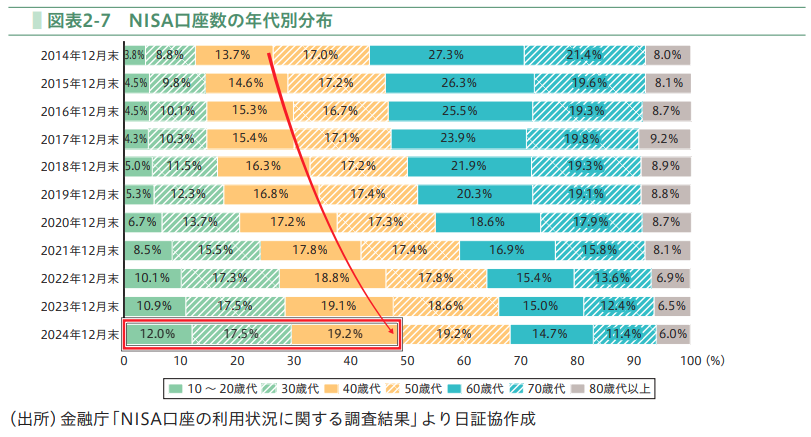 NISAの買付額を年代別に見ると、NISAの改正をきっかけにして、若い人がNISAを利用するようになってきています。