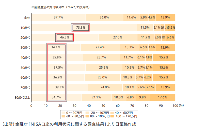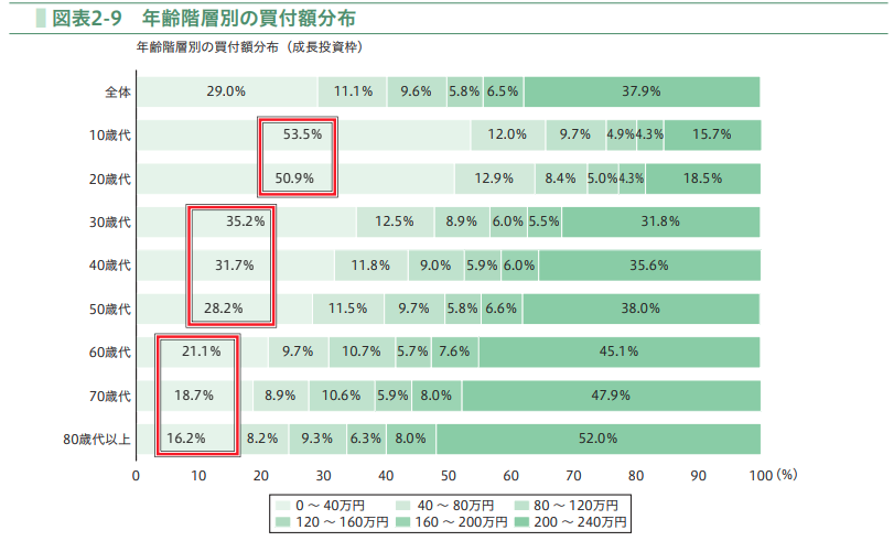 特に40歳以下の口座数が年々増加していることがわかります。さらに、年代別に買付額の分布が示されています。