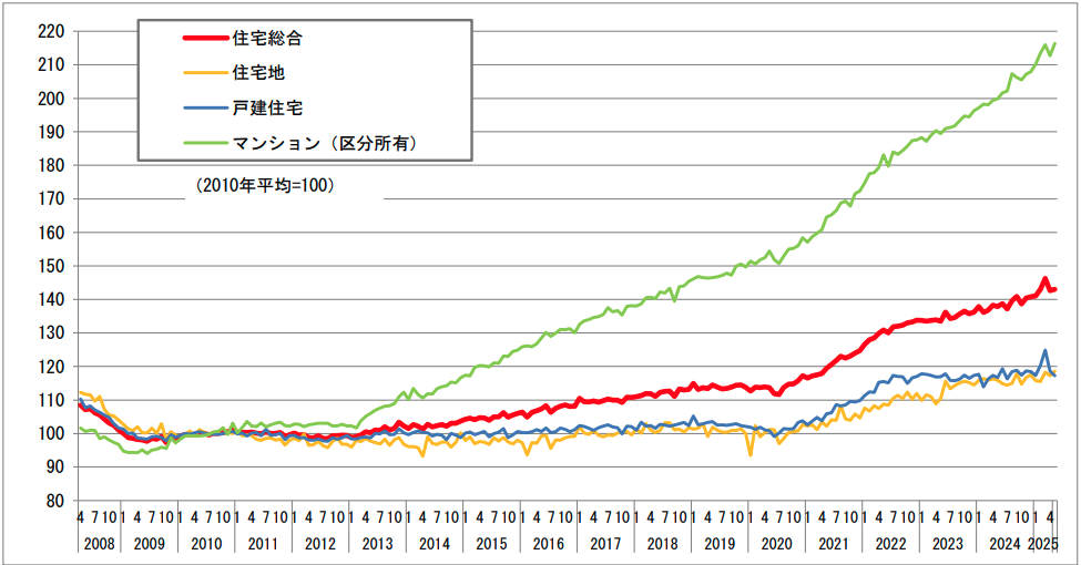 国土交通省「不動産価格指数」の推移(2010年平均=100)を見ると、住宅地や戸建住宅の価格に比べてマンション価格の値上がりが速いことがわかります。
