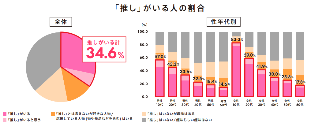 推し活は、自分が応援している人・ものの活動を支援して楽しむことです。「推し」の対象は幅広く、アイドル、アーティスト、俳優、アニメ・ゲーム・マンガのキャラクター、スポーツ選手、さらには動物、鉄道、刀剣といったものまで、いろいろあります。博報堂「オシノミクスレポート」によると、推しがいる人の割合は34.6%。若い人ほど推しがいる割合が多くなっています。また、推しがいる人の割合はどの年代でも男性より女性のほうが多くなっています。
