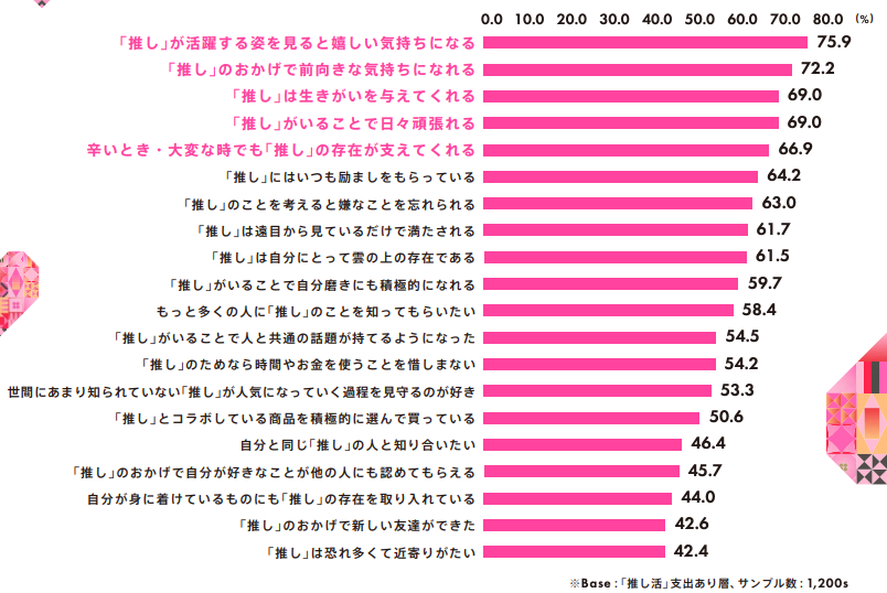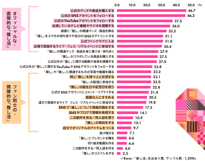 公式のグッズや商品を購入する、公式の情報をチェックする、ファンクラブやライブ・フェス・リアルイベントに参加するといった直接的な推し活が多いですね。それとともに、ファン同士で交流する、SNSでつながる、さらには二次創作をするといった間接的な推し活も行われていることもわかります。そうした推し活は人にポジティブなエネルギーを与えてくれます。