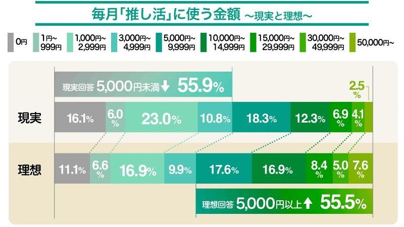 毎月20万円はさすがに極端ですが、理想の推し活のために5000円以上かけたいと回答した人が55.5%いるのも事実。推し活にもっとお金がかけられるのであればかけたい、と思っている人も多いようです。