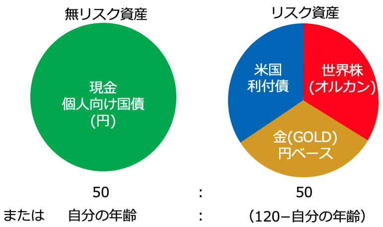 無リスク資産には個人向け国債を含めてOK。円金利上昇の恩恵を受けるなら「変動10年国債」がベターです。リスク資産は「米国株→世界株」「米国利付債」「金」の3つの資産に均等配分します。わかりやすさを重視して均等配分にしているので、リスク許容度が高いならば株の比率を高めてもOKです。