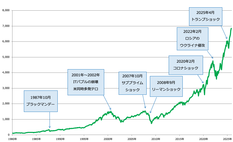トランプショックは、2024年〜2025年という短期的な目線で見ると大きな下落ですが、1980年以降のS&P500の動向を見ると、一時的な調整ととらえられるでしょう。