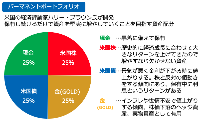 パーマネントポートフォリオの資産配分は、現金・米国株・米国債・金(GOLD)の4つの資産に25%ずつとなっています。