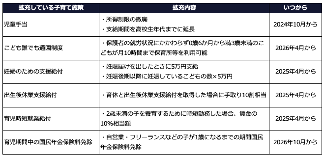 子ども・子育て支援金制度で拡充される主な給付には、次のものがあります。すでに給付が拡充しているものもあれば、これから拡充するものもあります。