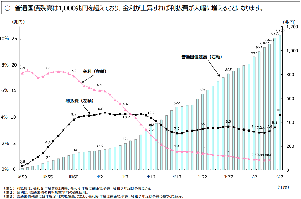 財務省の資料によると、国債の利払い費の金額・割合は2024年(令和6年)・2025年(令和7年)と急上昇していることがわかります。