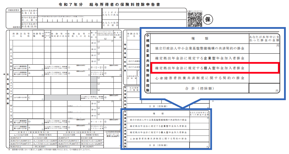 給与所得者の保険料控除申告書の「小規模企業共済等掛金控除」の項目にある「確定拠出年金法に規定する個人型年金加入者掛金」の欄に、iDeCoの掛金額を書きます。