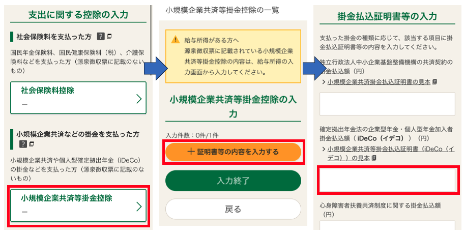 スマホやパソコンで確定申告ができる「e-Tax」(国税電子申告・納税システム)を利用している方もいるでしょう。e-Taxを利用する場合には、「支出に関する控除の入力」のページにある「小規模企業共済などの掛金を支払った方」→「証明書等の内容を入力する」を選択すると、「確定拠出年金法の企業型年金・個人型年金加入者掛金払込額(iDeCo(イデコ))」という欄が表示されます。この欄にiDeCoの掛金額(合計金額)を書きます。