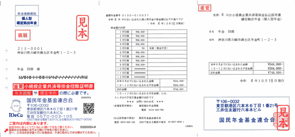 iDeCoを利用している場合、毎年10月から11月ごろになると、国民年金基金連合会から「小規模企業共済等掛金払込証明書」という用紙が届きます。小規模企業共済等掛金払込証明書には、iDeCoの掛金を1年間でいくら支払ったかが記載されています。