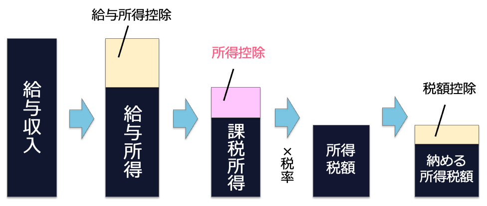 - 給与所得から、個々の事情に応じた「所得控除」を差し引き、課税所得を計算する