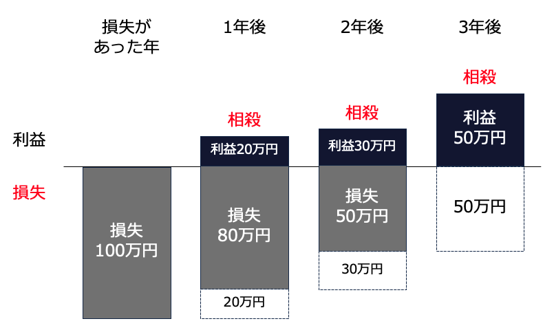 1年後に20万円、2年後に30万円、3年後に50万円の利益が出たという場合でも、損失と利益を相殺することで、この3年間の利益がゼロにできるので、利益に対して納める税金を減らすことができます。
