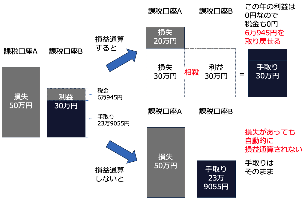 課税口座Aで50万円の損失、課税口座Bで30万円の利益があったとします。損益通算しなくても、課税口座Aでは税金はありませんが、課税口座Bでは利益の30万円に対して20.315%(6万945円)の税金が引かれるため、手取りは23万9055円になってしまいます。しかし損益通算すると、課税口座Aの損失と課税口座Bの利益が相殺できるため、この年の利益は0円、税金も0円になります。