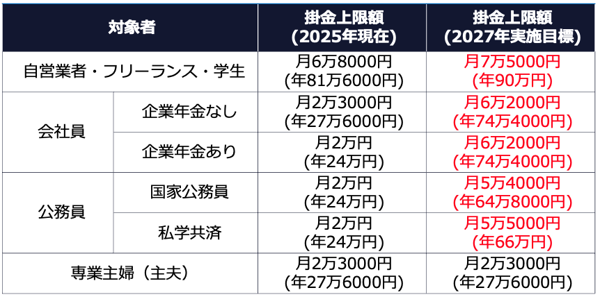 iDeCoの掛金は最低でも月額5000円からです。掛金の上限は、2025年時点では公的年金の種類や企業年金の有無により月額2万円〜6万8000円と定められています。この上限が2027年1月から次のように引き上げられる予定です。