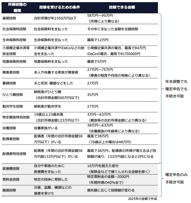 表にも記載していますが、医療費控除・寄附金控除・雑損控除の3つの所得控除は、確定申告でしか手続きできません(年末調整では手続き不可)。ですから、これらの控除を受けたい場合は会社員・公務員であっても確定申告を行う必要があります。